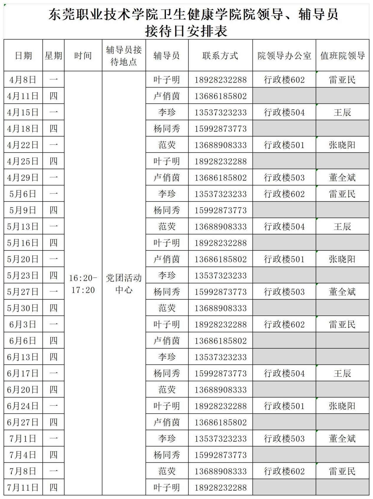 为面对面倾听师生诉求,实际解决师生关心关注的身边难题,公司本学期院领导、辅导员接待日具体安排如下: