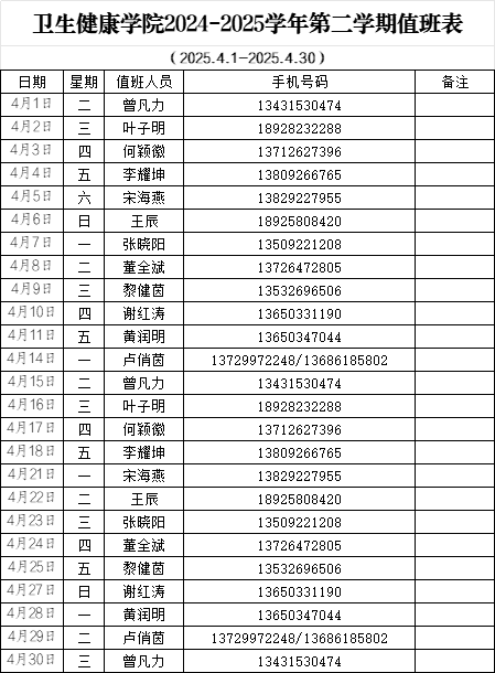 乐天使2024-2025学年第二学期值班表(4月)