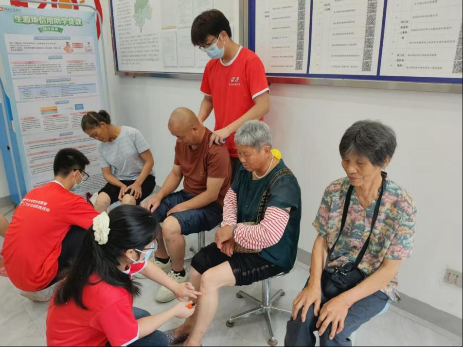 在葵潭镇吉镇村及江湾镇政府、湖洋村、中心小学等6个服务点,突击队师生充分发挥专业优势,为村民带来全方位健康服务。他们手持智能体脂检测仪等数字化设备,细致采集村民体脂率、BMI指数等数据,建立起“一人一档”的个性化健康档案,让健康管理更精准。针对农村地区高发的颈椎病、腰椎病、关节炎等疾病,队员们灵活运用艾灸、拔罐、耳穴压豆等中医适宜技术,为150余名村民量身定制诊疗方案,并贴心送上200余份足浴包。“连续做了几天理疗,不仅睡眠变好了,腰酸背痛也轻多了!”一位村民竖起大拇指连连称赞道。