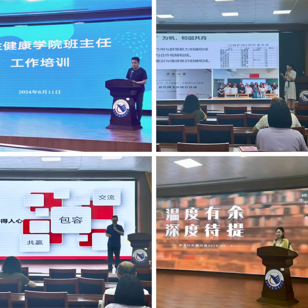 接着,三位班主任老师分别结合班级管理经验做了分享。22级护理3班班主任谢龙老师提供了有效策略与经验为班主任们排忧解难;22级康复治疗班班主任梁萍老师阐明了老师在给同学们提供有效建议的同时,也要注重深化本专业的知识深度;22级护理4班班主任邓国金老师将一个班级比喻作一帆船,以“诚”为帆、和谐共育,以“德为舵、用爱领航,以“专”为浆、自我成长。